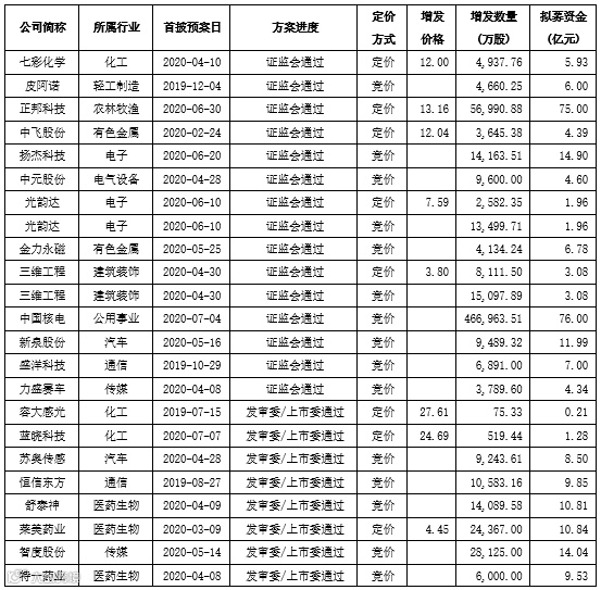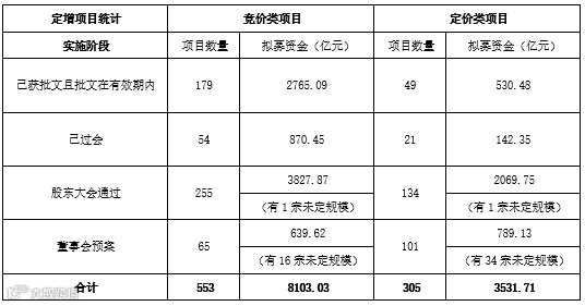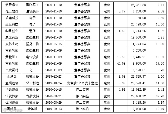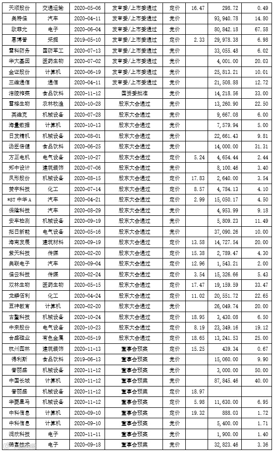截至2020年11月13日,实施状态处于不同阶段的竞价类和定价类定增项目汇总如下: