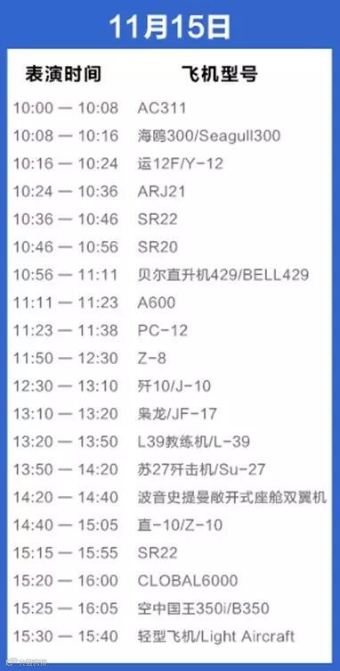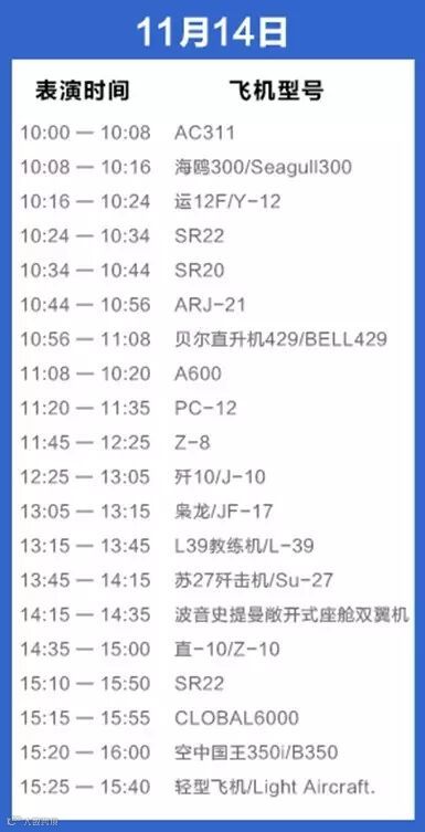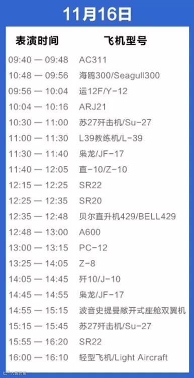 11月11日~11月13日为专业日,面向航空航天专业人士开放,没有门票销售;11月14日~11月16日为公众日,面向社会普通观众开放。每天开放时间为09:00~17:00。