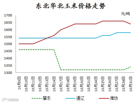 玉米价格涨幅最大的是华北地区,而华北地区中以山东最有代表性,如上图所示,山东地区10月9日玉米价格为1500元/吨,至10月31日涨至1640元/吨,上涨达140元/吨,涨幅达9.33%,而9月山东地区为跌幅最大的地区,下跌达440元/吨,10月上涨幅度不足9月下跌幅度的三分之一。