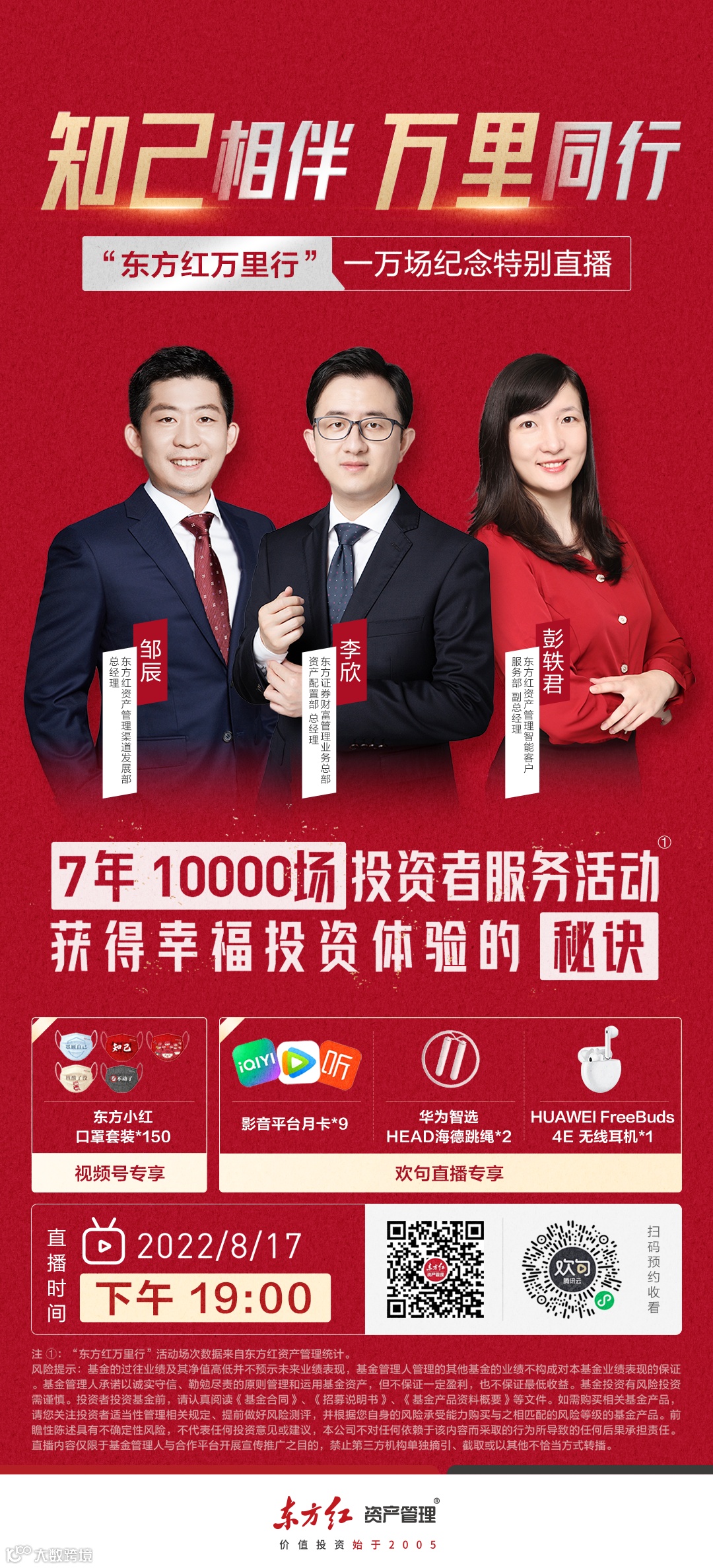 长期的投资者引导与陪伴是东方红努力成为投资者“知己”的使命与担当,是公司与合作伙伴、与投资者之间信任的纽带与桥梁。作为业内最早一批全面推广的系统化专业服务活动,“东方红万里行”客户服务活动自2015年8月14日开展以来,已经累计举办了超10000场交流活动,覆盖全国上百个城市、超过130万人。以持续、系统、专业的投资者引导与陪伴工作,向投资者传递价值投资、长期持有、资产配置和基金定投的理念与方法。