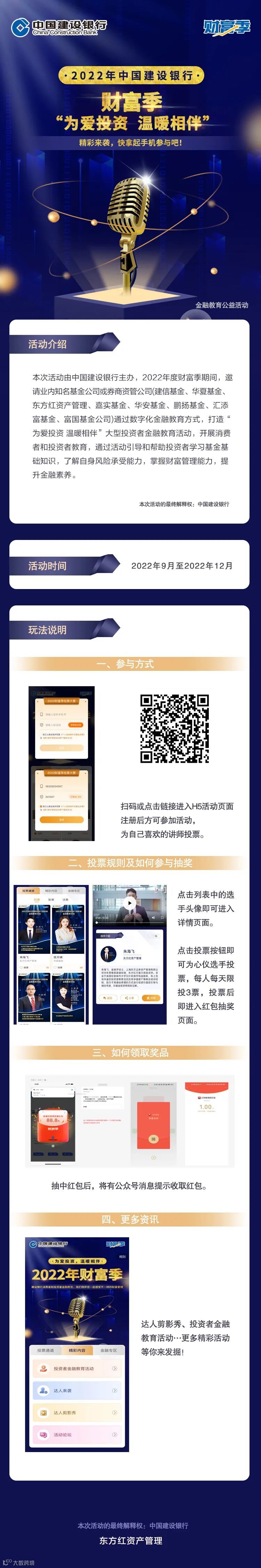 2022年建设银行打造“财富季”全民数字化金融活动,创新推出“为爱投资 温暖相伴”金融教育公益活动,邀请业内十家资产管理机构,打造“数字化宣教+投资者教育”相结合的金融教育视听盛宴。