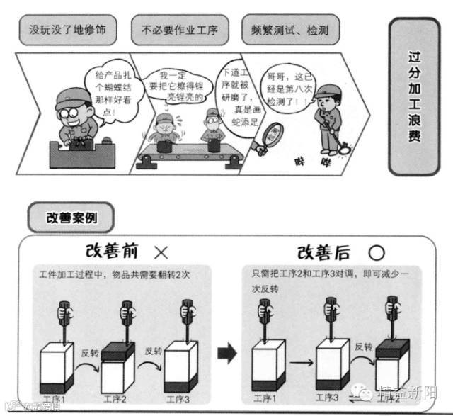 过分加工浪费是指加工质量或精度超过了下道工序需求或是客户需求而造成的过度加工的浪费,如:没完没了地修饰、频繁地测试、分类、检测。这些白白浪费了过多的工时、原材料和设备损耗等。在降低过度加工浪费的过程中可以对一些工序进行省略、合并或简化等。