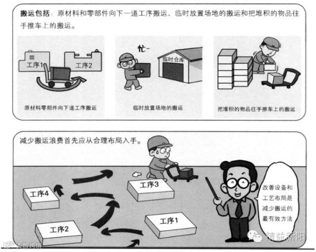 搬运动作遍及生产活动中的各个流程,包含放置、堆积、移动、整理等动作,但是搬运并不能产生附加价值,所以它本身就被认为是一种浪费。搬运包括原材料和零部件向下一道工序搬运、临时放置场地的搬运和把堆积的物品往手推车上的搬运。其中,设备布局不合理、生产线布局不合理、工序流程不合理等都是造成搬运浪费的主要因素。因此要想消除搬运浪费,首先应从合理布局入手,尽可能减少搬运。