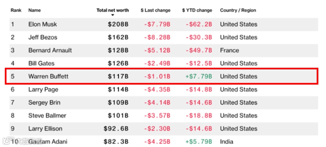 2022年3月7日,彭博亿万富翁指数(Bloomberg Billionaires Index)显示,91岁的巴菲特重返全球富豪榜前五名,其财富值为1170亿美元。