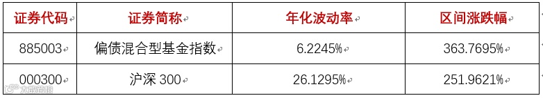 WIND数据显示,截至8月25日,具有“股债大类资产配置属性的”偏债混合型基金指数自基日(2003.12.31)以来,涨幅高于沪深300指数,同时波动也更低。