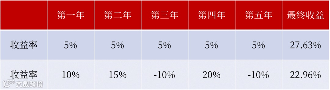 从可控性上看,本金和时间基本都是很难改变的,是由目前我们的客观条件决定的。但是,投资品的选择将决定你的收益率,而收益率对最终的结果影响巨大。所以,我们首先来看看不同的收益率波动对最终结果的影响。通常而言,即使看似平均收益一样的投资,波动越大,复利的效果越差。