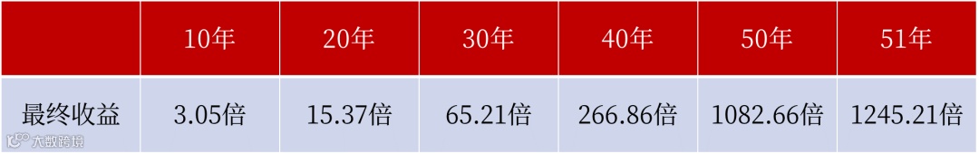 从上面的数据,我们可以看出,投资时间越长,复利的效果越显著。比如你投资10年只有3.05倍,而投资30年就变为65.21倍,投资50年增长超千倍,如果再坚持一年,投资倍数再增加百倍。