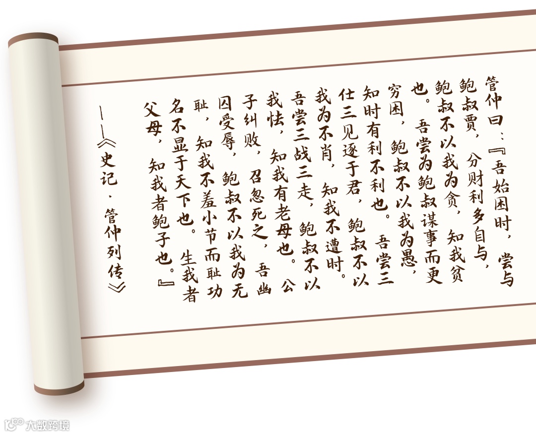 管仲与鲍叔牙年少时即相识,即使两人地位相差悬殊,鲍叔牙也从未看轻管仲。管仲生活困顿,尝试过经商、从政、参军,但均以失败告终,而鲍叔牙始终不离不弃地给予支持、理解和信任,坚定地与他并肩同行。数年后,鲍叔牙辅佐公子小白顺利即位成为齐桓公,而他却主动让贤,推荐彼时在敌对阵营辅佐公子纠的管仲为相。鲍叔牙充分相信管仲的谋略与品格,甘居其下,而管仲也了解鲍叔牙刚直不阿的性格难以在官场立足,两人相知相识、相辅相成,虽然困难重重,但始终携手并进,最终合力帮助齐桓公开创春秋霸业,并成就“管鲍之交”的千古知己佳话。