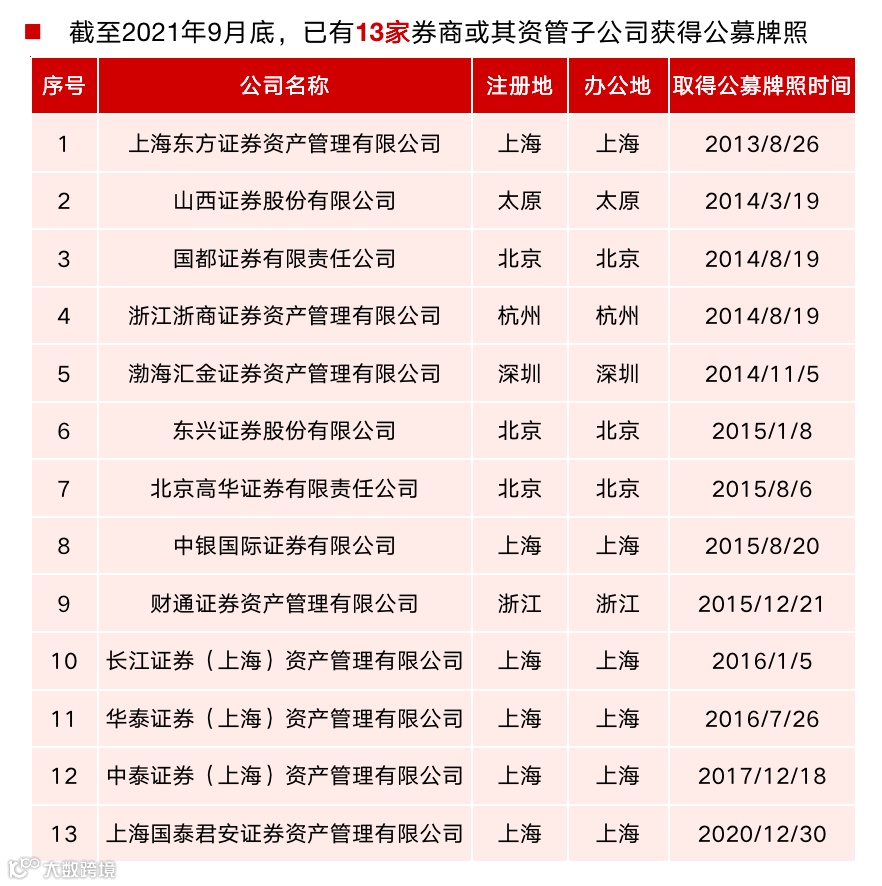 从各券商的进展来看,已经有13家券商或其资管子公司取得公募牌照,最早东方红资产管理在2013年8月就取得公募牌照,山西证券、国都证券、浙商证券、渤海汇金证券等公司在2014年获批,最新获批的是国泰君安资管。