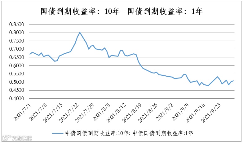 随后进入8、9月后,尽管经济数据一再边际下滑,但是长端利率却不见进一步下行。期间地产不断走弱,二手房成交几乎腰斩,同时受双控影响,部分城市开始拉闸限电,不断的负面消息也无法刺激长端利率进一步下行。市场聚焦于央行是否会继续释放流动性。在降准降息的预期迟迟无法兑现的情况下,加上季末等其他因素,短端1年国债收益率率先回到二季度末2.4%的水平,长端利率债则继续保持低位盘整。市场出现了涨不动也跌不动的情况。8、9月份10年国债在10bp内窄幅波动。