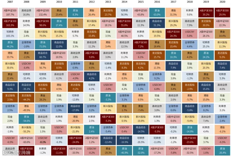 宏观经济和市场变化存在周期,在这个过程中,大类资产呈现出明显的轮动现象。根据中金公司研报,2011年至2020年的十年间大类资产收益图如下,从图中不难看出股票、债券、黄金、原油每一类都可能是当年度的明星资产,各领风骚一两年。