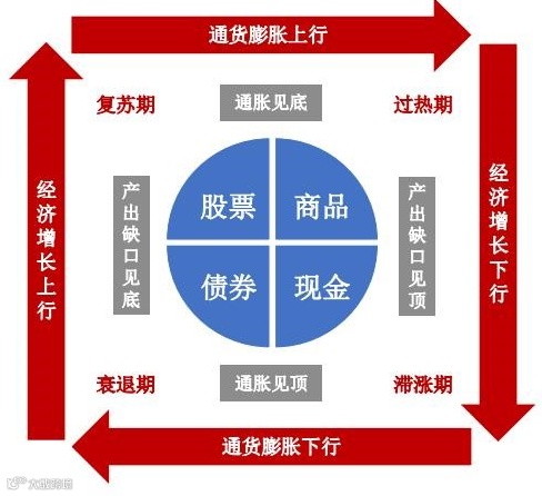 这意味着,如果投资者有足够的经济学金融学知识,能够通过科学的大类资产配置,动态把握大类资产轮动规律,就有可能进一步提升组合的超额收益水平。如何利用大类资产轮动规律为投资服务?基于对美国从1973年到2004年的30年历史数据研究,美林证券发表了著名的研究报告《The Investment Clock》,研究在经济的不同阶段相对应的大类资产配置策略,被市场称之为“美林时钟”。