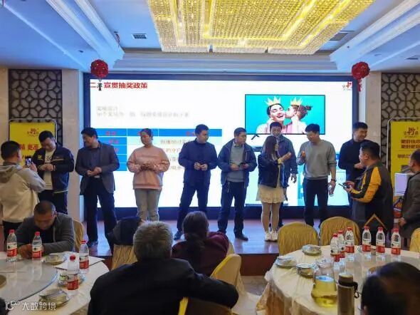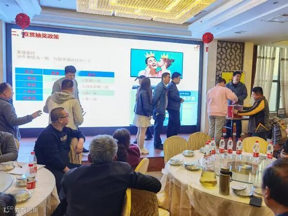运城市区域经理李金鹏首先向参会的经销商宣读了并强调了公司统一零售价,并公布了处罚措施;接着介绍了会议政策,从优惠力度到抽奖礼品进行解读。二级经销商针对现场会议政策和抽奖产品又进一步坚定了订购的决心。