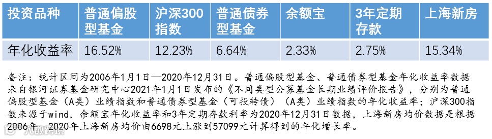 那么先来看这样一组数据,自2006年1月1日至2020年12月31日,沪深300指数的平均年化收益达到12.23%,可以说是个不错的市场。再来看中国的偏股型基金,在银河证券基金研究中心的统计报告中,普通偏股型基金(A类)业绩指数在2006年1月1日至2020年3月31日期间的平均年化收益率达到了16.52%,这个数字跑赢了沪深300指数平均每年12.23%的年化收益率,也跑赢了上海新房价格涨幅的年化收益率。
