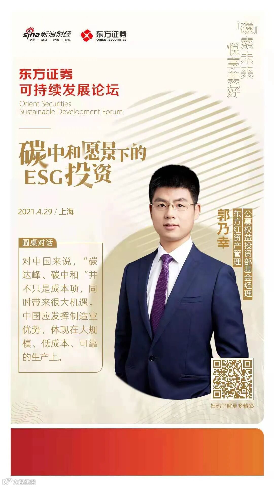 4月29日,由东方证券和新浪财经联合举办的东方证券•可持续发展论坛在上海召开,本次活动主题为“碳中和背景下的ESG投资”。东方红资产管理公募权益投资部基金经理郭乃幸出席会议,并参与圆桌讨论。