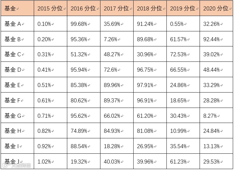 某一年份表现特别优秀的基金产品,之后年份业绩往往表现不一,后面两三年容易陷入沉寂,有的基金之后再度崛起,有的基金可能就此归于平凡。让我们再来看看上一轮大牛市2015年权益类基金排名前十名的产品,之后几年在同类基金中的排名分位数。