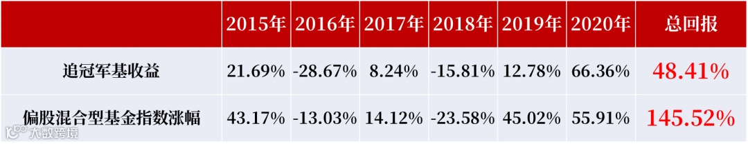 假如投资者于2015年初投资了2014年偏股型混合型基金的冠军,2016年年初投资2015年涨幅最高的偏股混合型基金,以此类推,每年都买入上一年的冠军基金,那么到2020年年底最终收益如何?