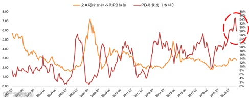 市场估值分化正在逐步修复,历史均值是14%,1个标准差是8%,目前基本还在一个标准差以上,这轮修复主要是通过茅指数急跌修复的。下图中PB的离散度衡量各行业间PB的分化程度,PB离散度=各行业PB所处自身历史分位数的方差。