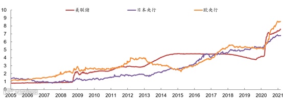 全球大放水的阶段已经进入平稳期,美、日、欧央行已分别较疫情前扩表81.2%、22.6%和51.7%。