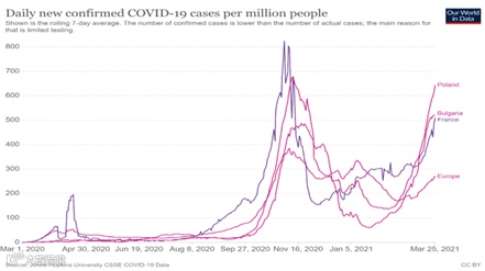 疫苗接种方面,美国、英国接种率均超过40%,预计美国最快可在6月上旬接近群体免疫;欧洲停用阿斯利康疫苗,疫情也出现新高,单日确诊连续升高。欧盟接种目标或难以完成(目标是2021年夏天,成员国至少接种整个成年人口的70%)。