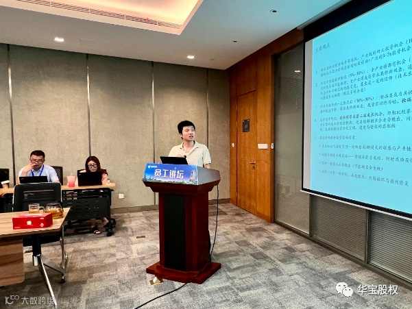 为进一步打造学习型组织,营造公司比学赶超的氛围,倡导员工扎根投研工作,华宝股权开展员工讲坛系列活动,鼓励业务骨干走上“讲台”分享交流,做好知识和技能的接力和移植。
