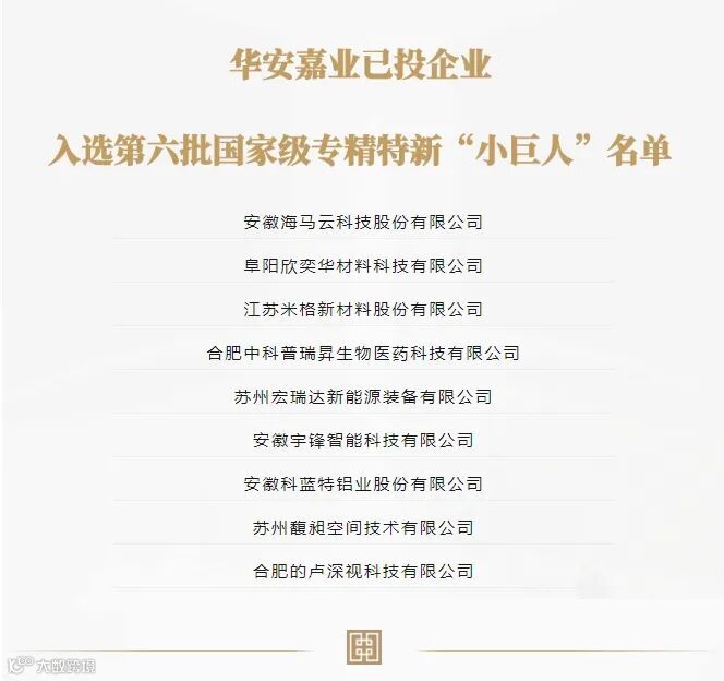 在第六批国家级专精特新“小巨人”企业公示名单中,安徽海马云科技股份有限公司等9家华安嘉业已投企业入选。除第六批入选企业外,华安嘉业已投企业中,安徽舜禹水务股份有限公司、会通新材料股份有限公司、安徽长飞先进半导体股份有限公司、合肥康芯威存储技术有限公司、江苏美科太阳能科技股份有限公司等39家企业也于既往批次荣获国家级专精特新“小巨人”企业称号。截至目前,华安嘉业投资入选国家级专精特新“小巨人”企业共计48家,占总投资项目数近四成。