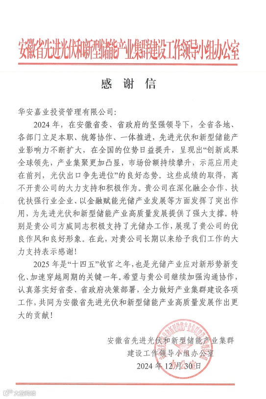 ◉ 收到安徽省先进光伏和新型储能产业集群建设工作领导小组办公室的感谢信