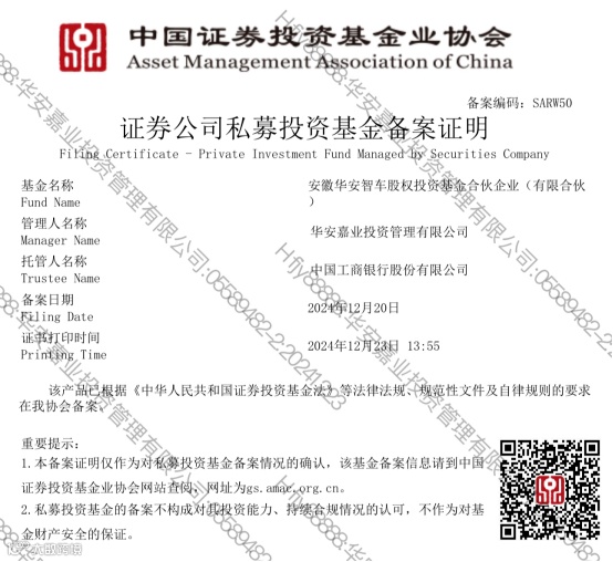 12月23日,省新能源汽车和智能网联汽车产业主题基金子基金——安徽华安智车股权投资基金合伙企业(有限合伙)正式备案设立,规模10亿元。未来将聚焦新能源汽车和智能网联汽车产业方向进行投资,加快建设具有国际竞争力的新能源汽车产业集群,不断培育壮大新质生产力。