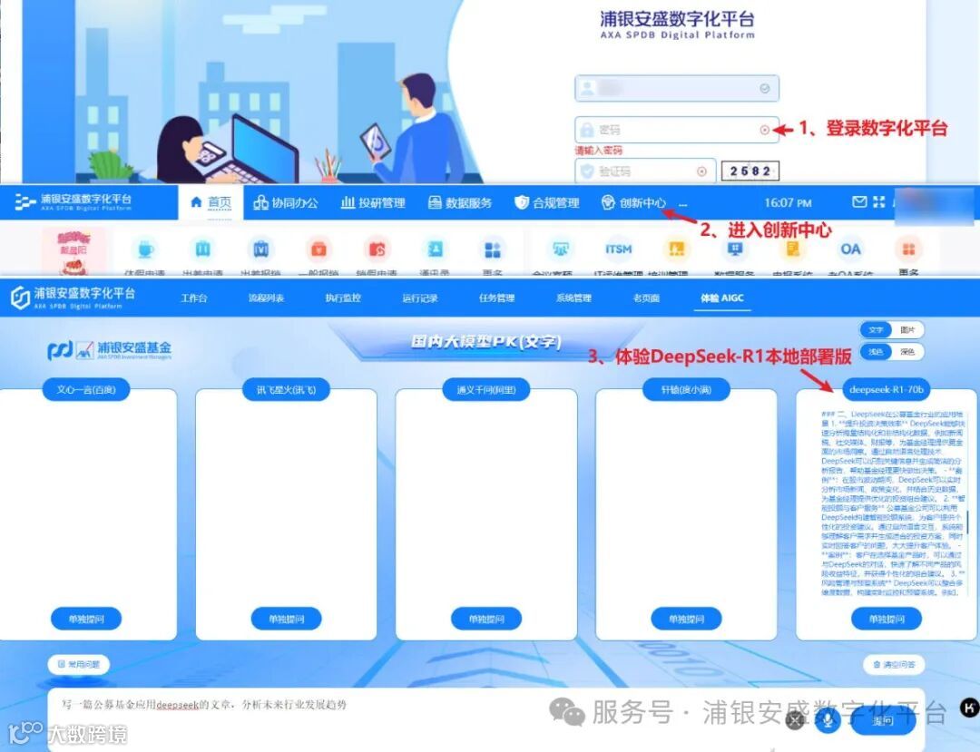 亲爱的各位同事,火爆全球的DeepSeek已在公募领域掀起创新浪潮,我司已完成DeepSeek-R1-70b开源模型私有化部署,欢迎登陆数字化平台(e.py-axa.com)-创新平台体验。