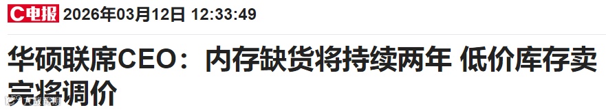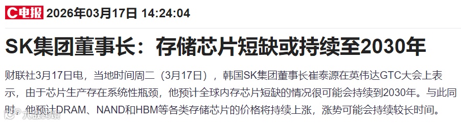 另外,再重点更新一下存储。相较于算力,存储今天表现还算比较抗跌。SK Hynix董事长崔泰源在GTC接受记者采访时表示,存储芯片的短缺可能会持续到2030年。