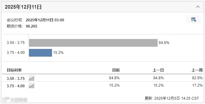 首先是进行的美联储议息会议(12月9-10日),降息25bp概率高达85%,几乎没有悬念。