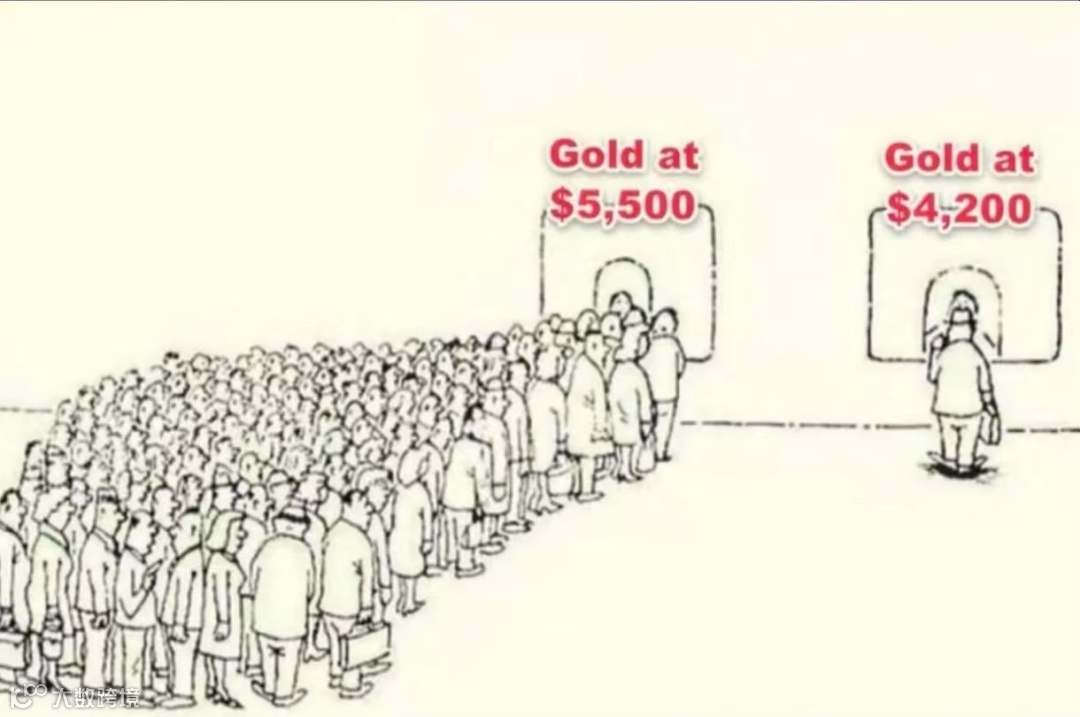 写在最后,今天看到一张图,挺有意思。5500美元的黄金,挤满了购买的人群,而当黄金跌至4200美元,则变得门可罗雀。