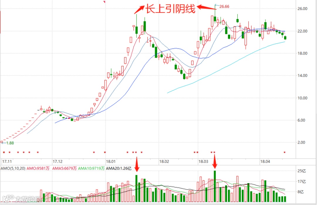 高位放量阴是龙头股见顶的最典型特征,这里的放量阴主要指两类:一类是高位放量巨阴;另一类是高位放量长上引阴线。以下就具体案例进行分析。