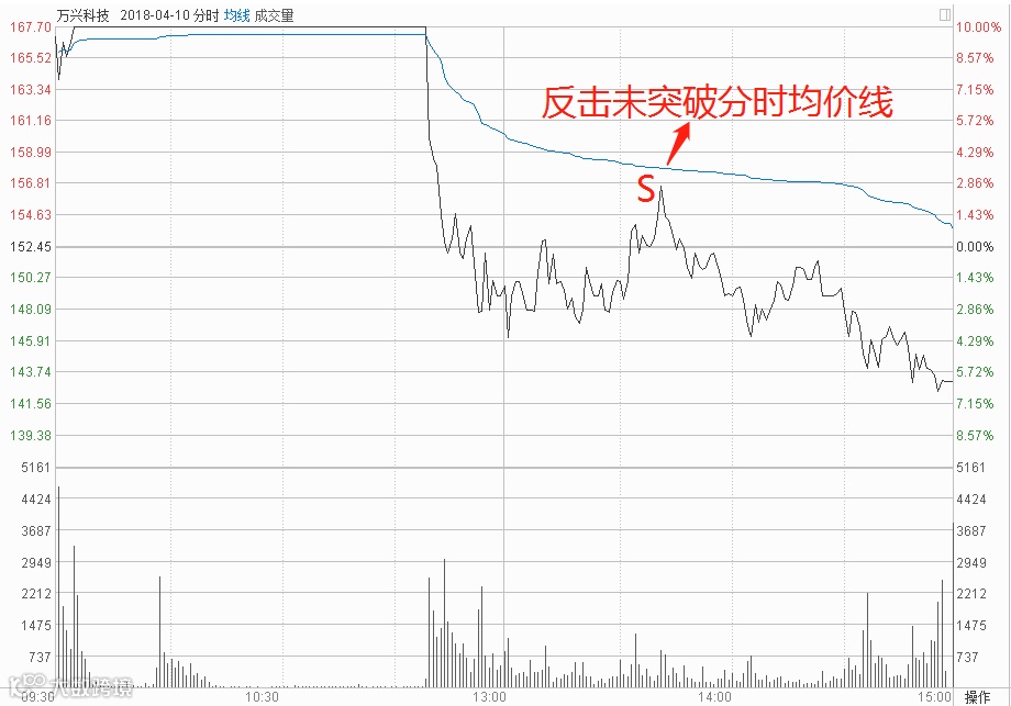 我们结合当天的分时图来看,万兴KJ临近中午收盘突然开板,股价像直接垮掉一样,几乎没有任何反抗,午后一度小幅反抽,但成交量并未显著放大,且股价也未能突破分时均价线,这时候应该坚决出局,不要有任何留念。