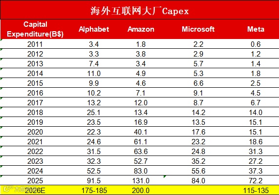 亚马逊指引26年Capex2000亿美元,同比+52%左右。