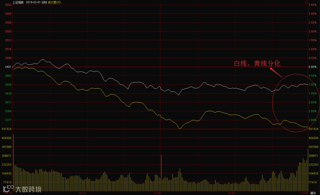 接下来,我们再回到2018年2月1日沪指的分时图。从下图我们不难看出,代表沪指实际指数的白线和代表市场真实情况的黄线在尾盘出现了明显的分化。