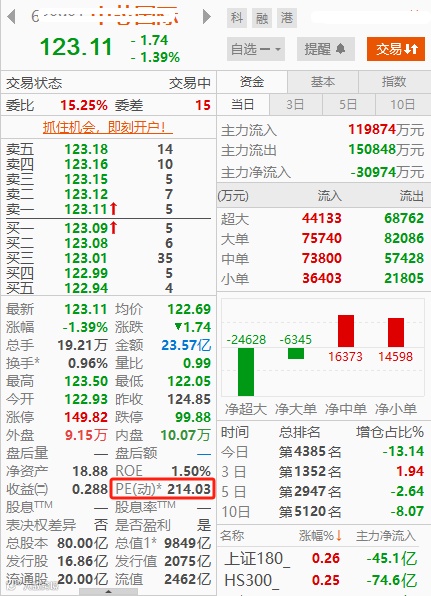那么,我们该如何看呢?以中XG际为例,打开交易软件之后,在页面的最右端,快刀标注红框的地方就是我们经常谈到的市盈率,该股目前的市盈率为214.03倍。