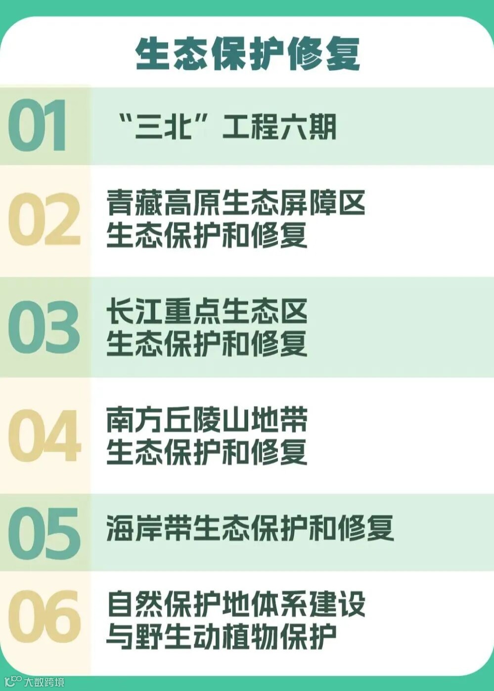例如:重点生态区荒漠化、石漠化、水土流失治理。河湖湿地、海岸带、森林、草原生态修复。生物多样性保护,建立自然保护区体系。