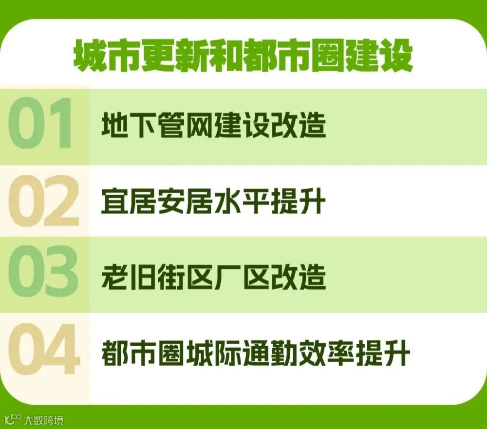 城市更新和都市圈建设:城市提质升级,同时以大城市为核心,联动周边中小城市、县城。轨道交通互联互通,避免 “大城市过度拥挤,小城市空心化”。