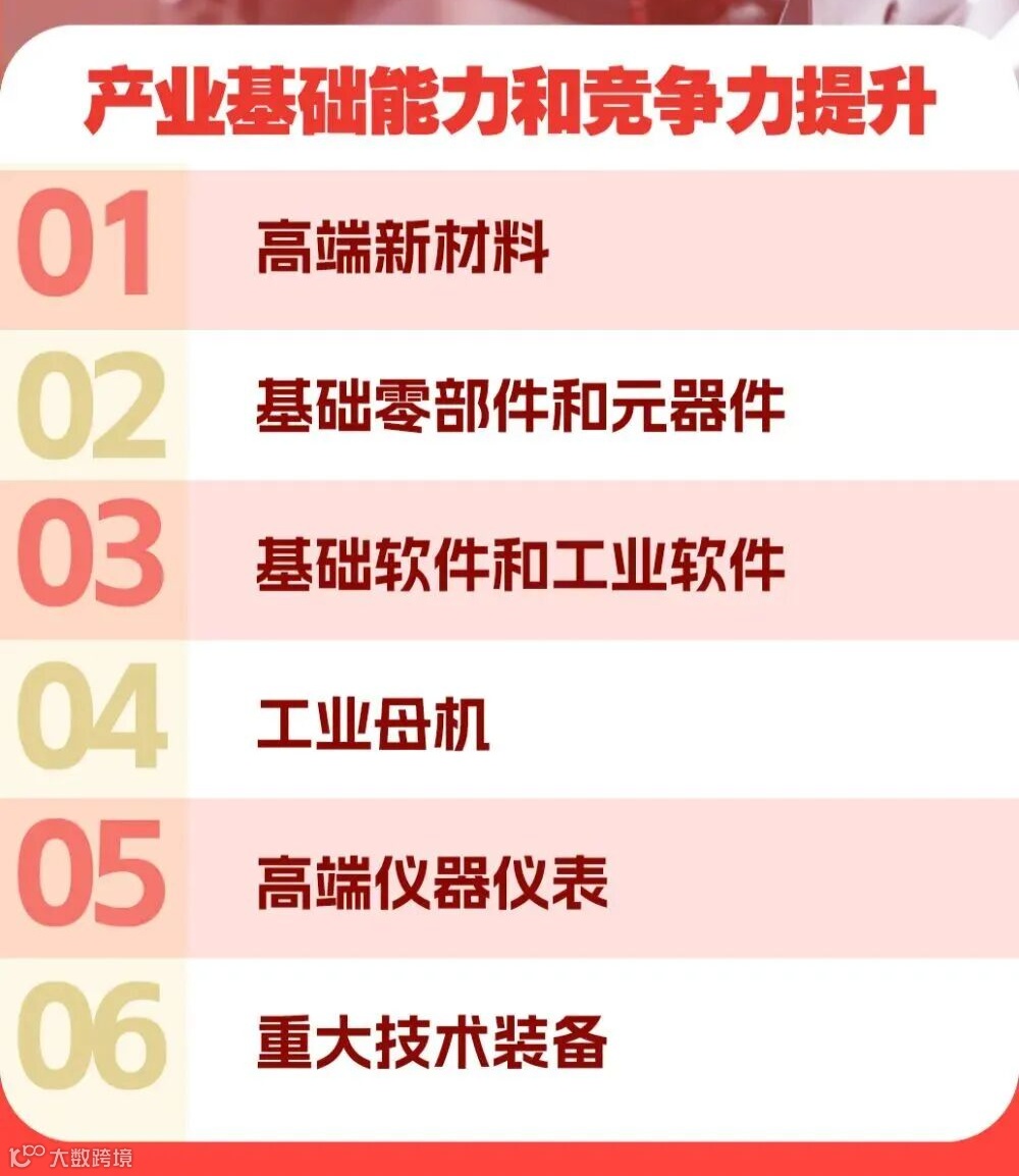 产业基础能力和竞争力提升(打地基、补短板):聚焦六大基础领域,解决产业 “大而不强、全而不精”问题,攻克卡脖子,筑牢产业链自主可控的底层能力。让材料、零部件、软件、装备不再依赖进口,提升全产业链质量、效率与安全。