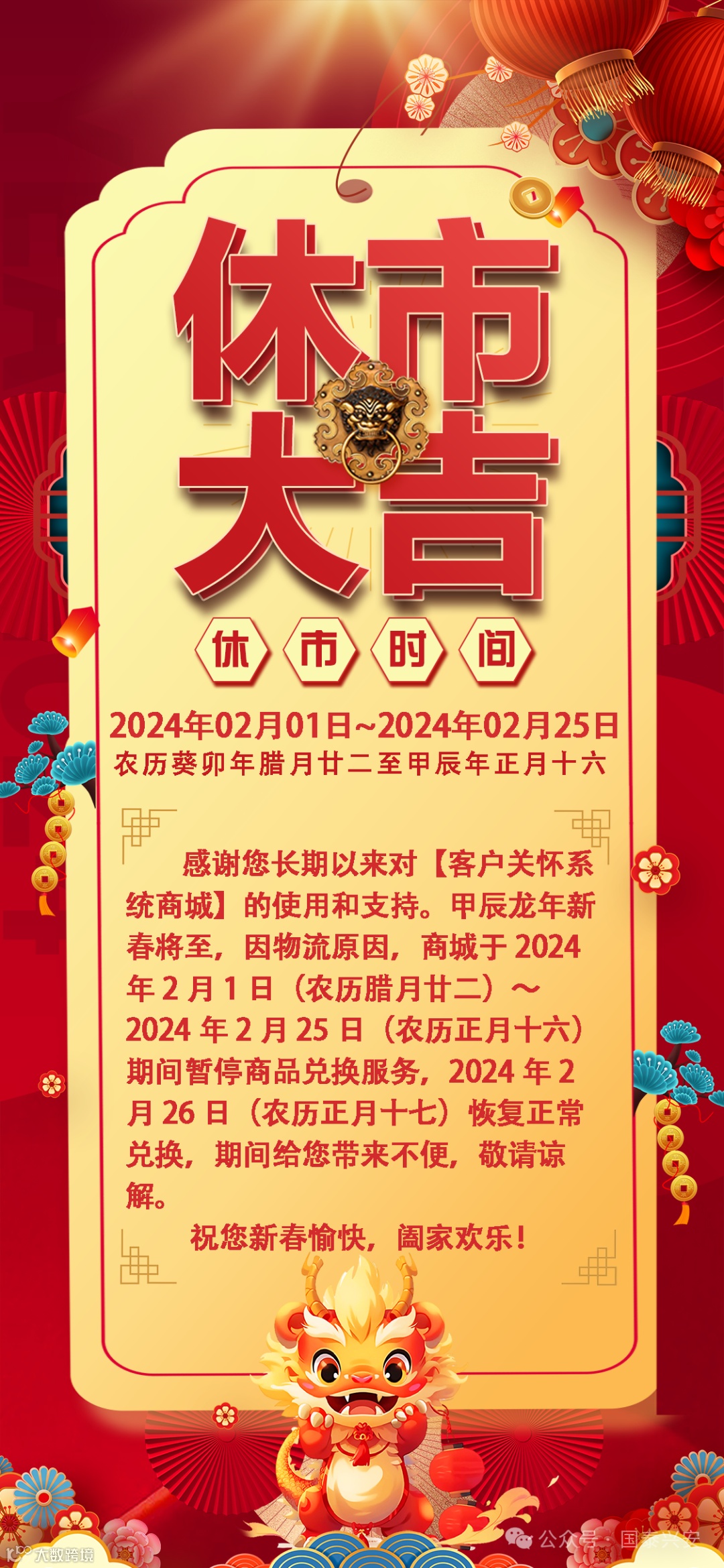 【通知】关怀系统商场2月1日~2月25日暂时休市