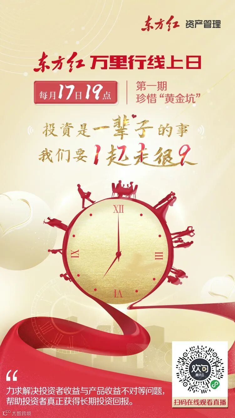 为了陪伴您一起度过市场周期,更好地进行投资理念的交流分享,我们将每月17日19点设为“东方红万里行线上日”,通过线上直播的方式与您分享价值投资的相关理念。我们选择这一时间的寓意在于,我们希望投资是一辈子的事,我们要一起(17)走很久(9)。