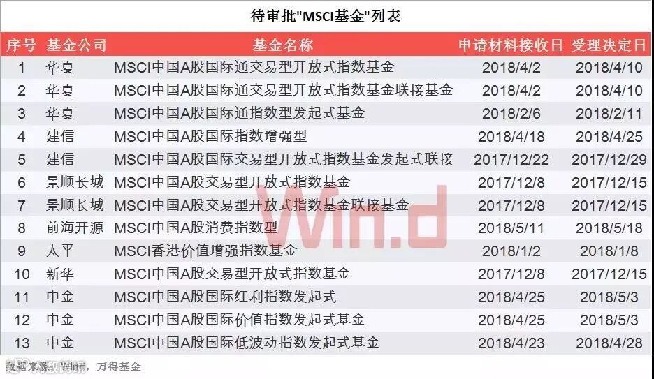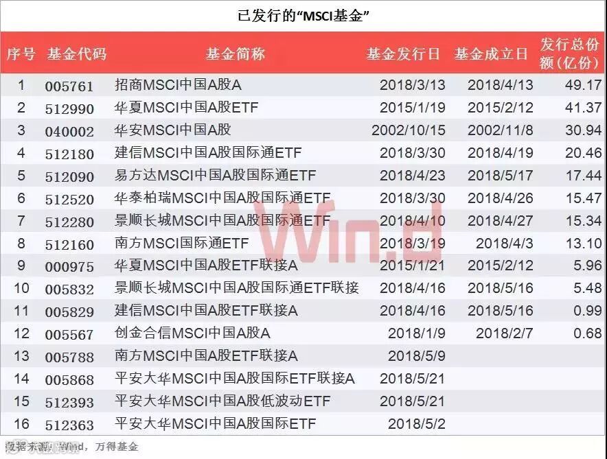 自从2017年6月份宣布A股纳入MSCI后,国内多家公募基金公司积极布局相关产品,截止2018年5月31日,华夏、建信、南方、招商等基金公司一共发行了16只MSCI指数基金,如下表: