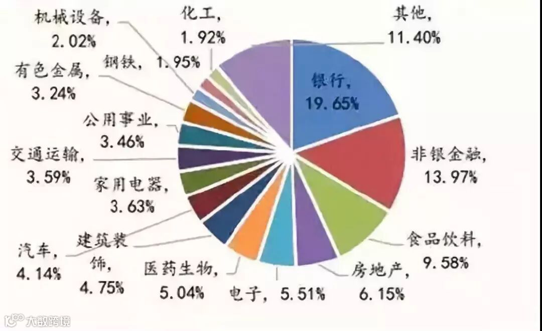 从行业来看,主要集中在大金融和大消费板块,各行业的权重如下图所示: