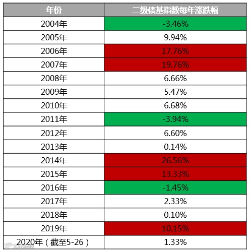 (数据来源:Wind,时间为2004-01-01-2020-05-26,展示的为混合债券型二级基金指数 (指数代码:885007.WI)每年的涨跌幅,指数涨跌幅能一定程度反映产品市场整体情况,但不代表具体产品情况。)