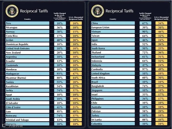 根据白宫文件,英国和澳大利亚等21个国家分别被加征10%关税,其次是欧盟20%、日本24%、中国34%、越南46%,柬埔寨49%。