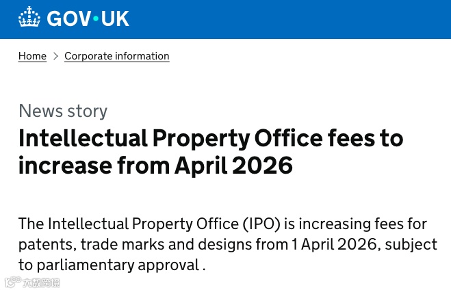 英国知识产权局(IPO)宣布,将于2026年4月1日起上调专利、商标和外观设计的相关费用。
