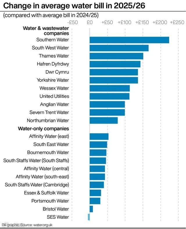南方水务公司的客户家庭水费账单将涨至每年703英镑,涨幅达到47%,而Hafren Dyfrdwy和西南水务公司的账单将上涨32%。