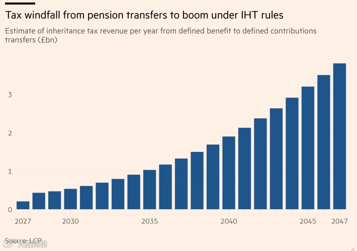 尽管政府称到2029/30年,养老金税变化将每年增加14.6亿英镑的额外收入,但据精算顾问Lane Clark & Peacock计算,该数字将在2040年代中期飙升至每年30多亿英镑。