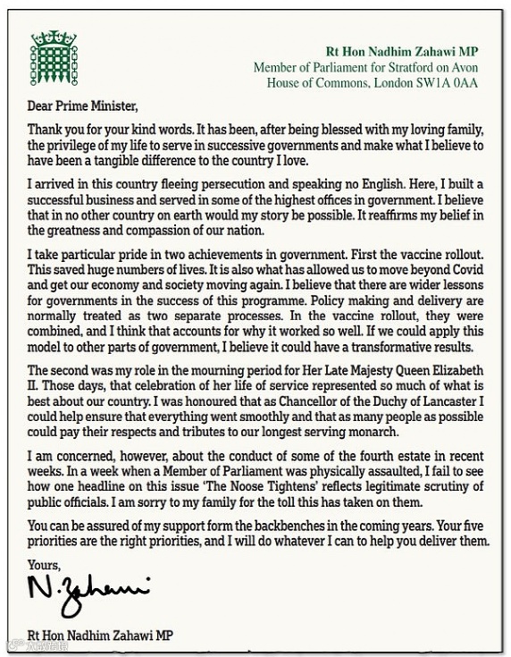 2021年9月,他担任第一任国务卿,回到教育部。次年,约翰逊的垮台在公众面前上演,随之而来的混乱让他再次晋升,在约翰逊戏剧性辞职后,扎哈维接替苏纳克任财政大臣。